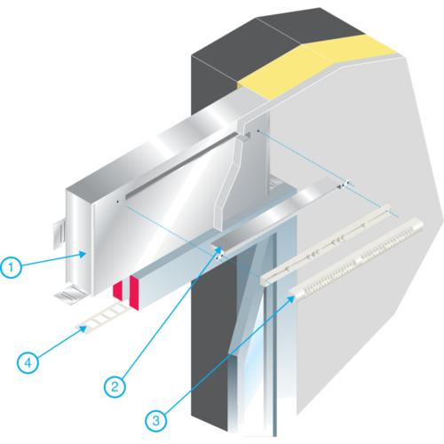 - en aislamiento interior: fijado por encima de la ventana y colocado en el forrado interior, el manguito MHF acústico permite el montaje de una viserilla estándar o de una pletina por el lado exterior y de una entrada de aire asociada a un MEA 45, MEA 85 o TM por el lado interior,