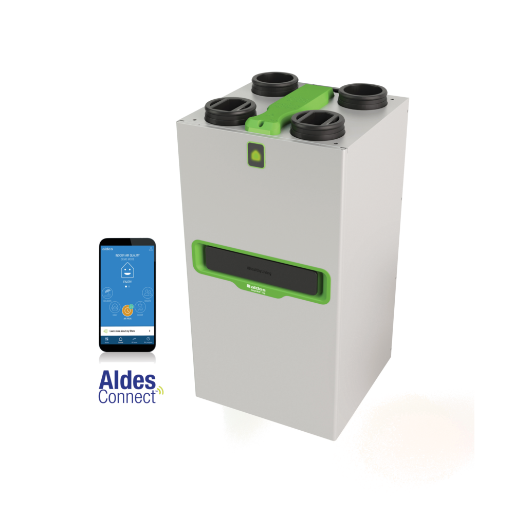 Solución de ventilación doble flujo conectada que filtra eficazmente los contaminantes más finos y se adapta a las necesidades del usuario.